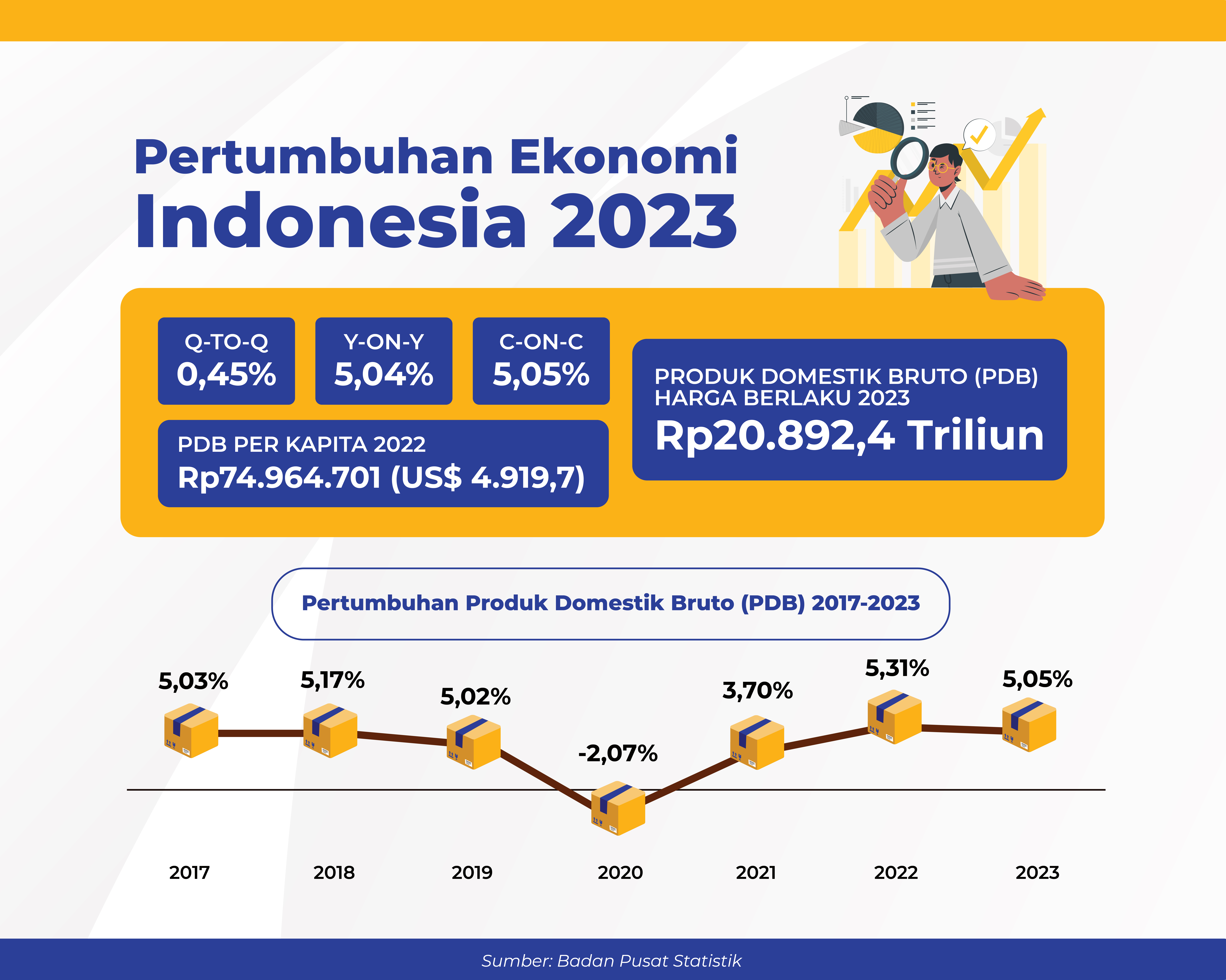 Perekonomian Indonesia 2023 yang diukur berdasarkan Produk Domestik Bruto (PDB) atas dasar harga berlaku mencapai Rp20.892,4 triliun dan PDB per kapita mencapai Rp75,0 juta atau US$4.919,7. Ekonomi Indonesia tahun 2023 tumbuh sebesar 5,05 persen, lebih rendah dibanding capaian tahun 2022 yang mengalami pertumbuhan sebesar 5,31 persen.