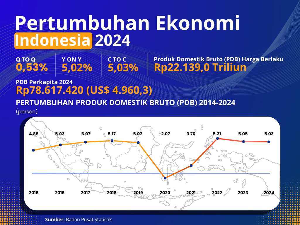 Ekonomi Indonesia tahun 2024 tumbuh sebesar 5,03 persen. Pertumbuhan ini menjadi salah satu indikator perbaikan kinerja ekonomi dibanding periode sebelumnya.